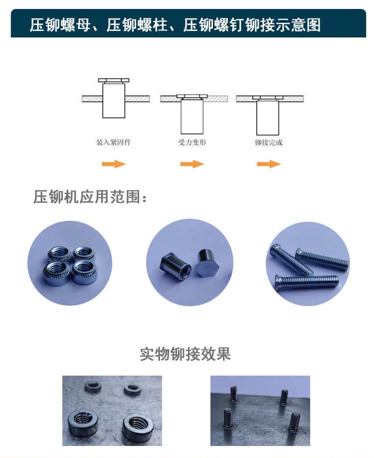 無錫思拓的6噸、8噸液壓壓鉚機,其中還可分為普通型噸/8噸液壓壓鉚機,和智能型6噸/8噸液壓壓鉚機,還可以選配裝置,主要適合鈑金加工過程中壓鉚螺母、壓鉚螺柱和壓鉚螺釘的壓鉚作用,如果再進行細分的話,那可以分為螺母液壓壓鉚機,螺柱液壓壓鉚機,全自動送螺母螺柱螺釘液壓壓鉚機,精密液壓壓鉚機,防壓手液壓壓鉚機。