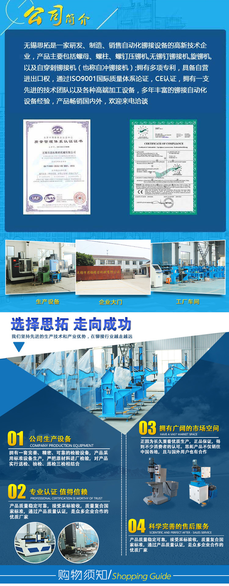 無錫思拓TOX鉚接機公司成立于2009年,一直是堅持自主研發(fā),擁有3000多平方的廠房,更是培養(yǎng)了一批鉚接機專業(yè)人才,獲得專利和軟件著作權(quán),具備自營進出口權(quán),無鉚釘鉚接機還有專業(yè)技術(shù)團隊,公司領(lǐng)導更是下大成本采購多臺高端加工設(shè)備,用來加工TOX無鉚釘鉚接機,進口的加工中心,超大龍門式機床,多臺數(shù)控車床和加工中心,檢測設(shè)備齊全,檢驗要要嚴格,所以才有那么多的客戶選擇無錫思拓TOX鉚接機,建立長期合作關(guān)系,并介紹多家客戶,若有更多關(guān)于無鉚釘鉚接機疑問可直接電話與我聯(lián)系。