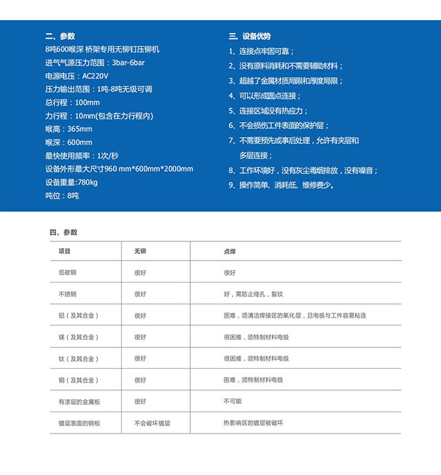 從無鉚釘鉚接機的出力來分,可以分為5噸壓力無鉚釘鉚接機,8噸壓力無鉚釘鉚接機,10噸壓力無鉚釘鉚接機,15噸無鉚釘鉚接機,20噸無鉚釘鉚接機,30噸無鉚釘鉚接機,40噸無鉚釘鉚接機,50噸無鉚釘鉚接機,80噸無鉚釘鉚接機,100噸無鉚釘鉚接機......